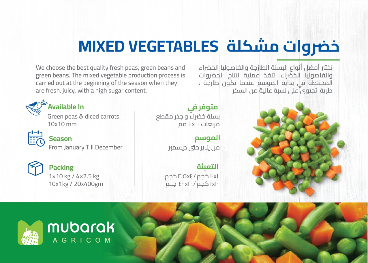 Harvested at the optimal maturity for maximum flavor and texture Flash-frozen immediately after picking to preserve nutrients and color Perfectly portioned blend of essential vegetables Vibrant hues and tender, crisp bite High in essential vitamins, minerals, and antioxidants Versatile and easy to prepare, Mubarak's frozen mixed vegetable medley is an invaluable time-saving ingredient. It's perfect for stir-fries, soups, casseroles, and side dishes, providing a nutritious, flavorful boost to any meal. Their exceptional quality and consistent availability make them an indispensable item for discerning chefs, meal kit providers, and health-conscious consumers worldwide. Contact our team today to learn more about our premium frozen mixed vegetable offerings and how we can customize our products to meet your specific needs.